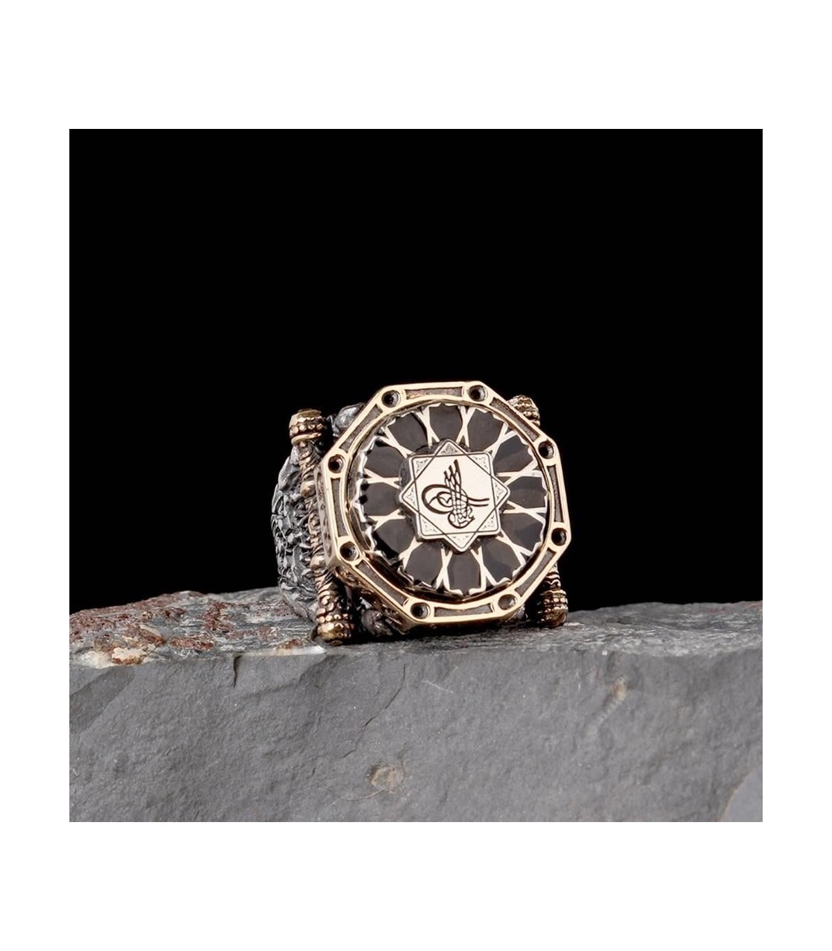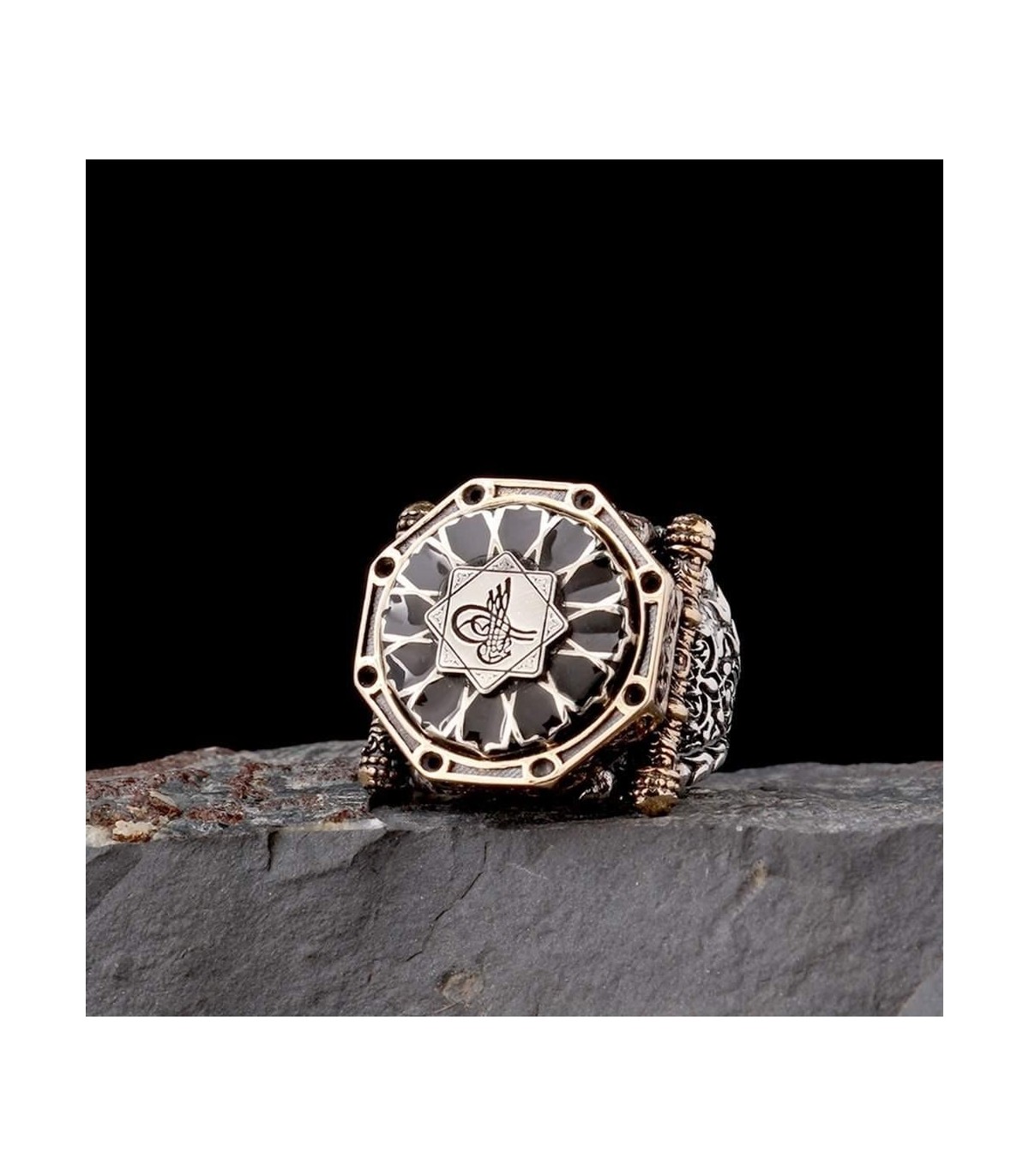 Sekizgen Tasarım: Yüzüğün sekizgen formu, geleneksel Türk ve İslam sanatındaki yıldız motiflerine atıfta bulunur. Sekizgen, hem estetik olarak güçlü bir duruş sergiler hem de "sekiz cennet kapısı" gibi mistik anlamlar taşır. Bu tasarım, yüzüğe sadece görsel değil, aynı zamanda ruhani bir boyut da ekler. Ayrıca Sekizgen, matematiksel ve geometrik açıdan kusursuz bir formdur. Tarih boyunca sekiz köşe, denge, düzen, sonsuzluk ve koruma sembolü olarak kullanılmıştır. Özellikle kalkan formunda işlendiğinde, cesaretin ve savaşçı ruhun göstergesi haline gelir.