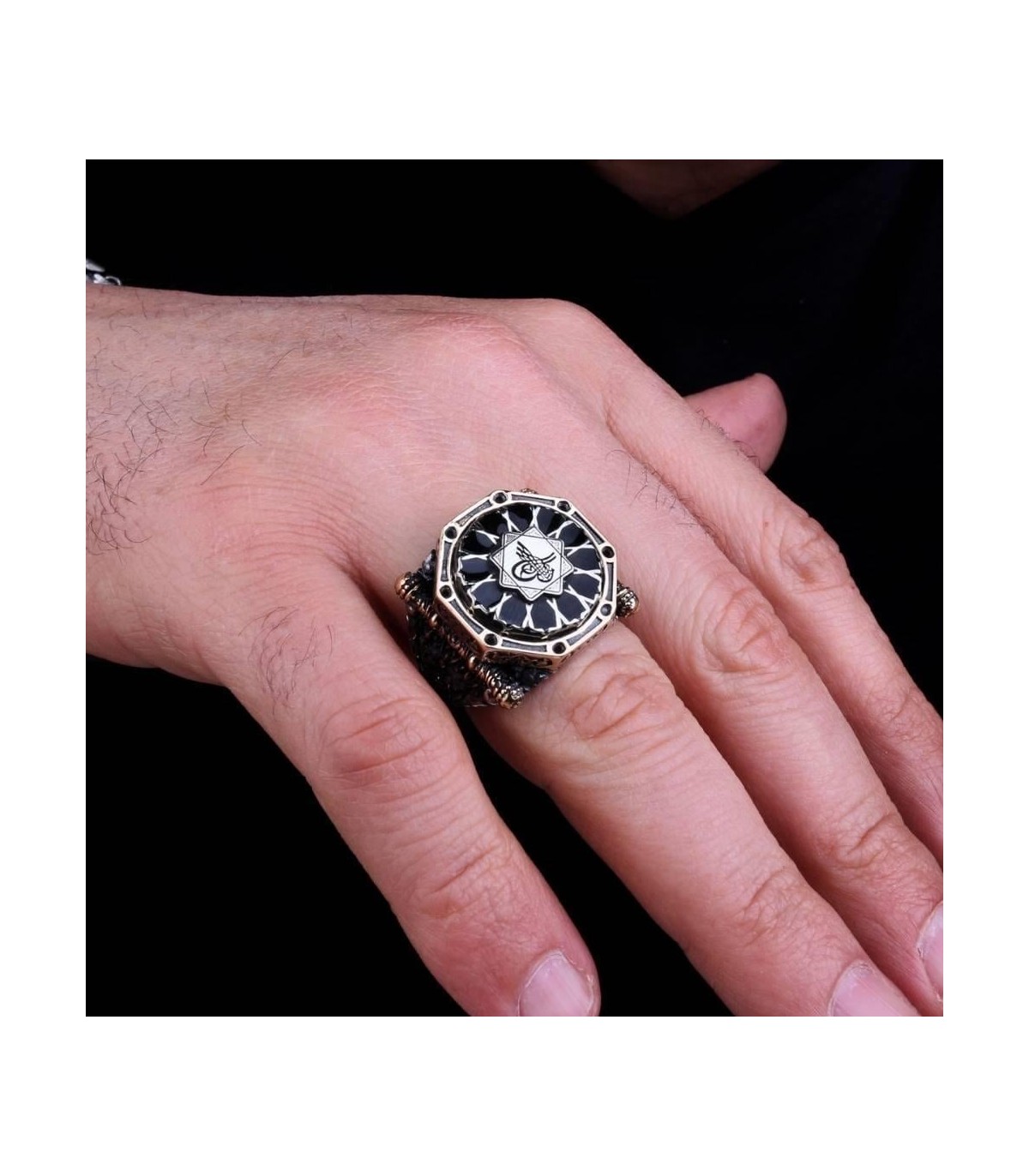 Mina Silver'ın özel tasarım Osmanlı Tuğralı gümüş yüzüğü ile tarihin ve zarafetin birleşimini parmağınızda taşıyın. El işçiliğiyle hazırlanan bu yüzük, siyah mine detayı ve oksitli gümüş yapısıyla maskülen bir şıklık sunuyor. Kendine özgü stiliyle dikkat çekmek isteyen beyler için ideal.