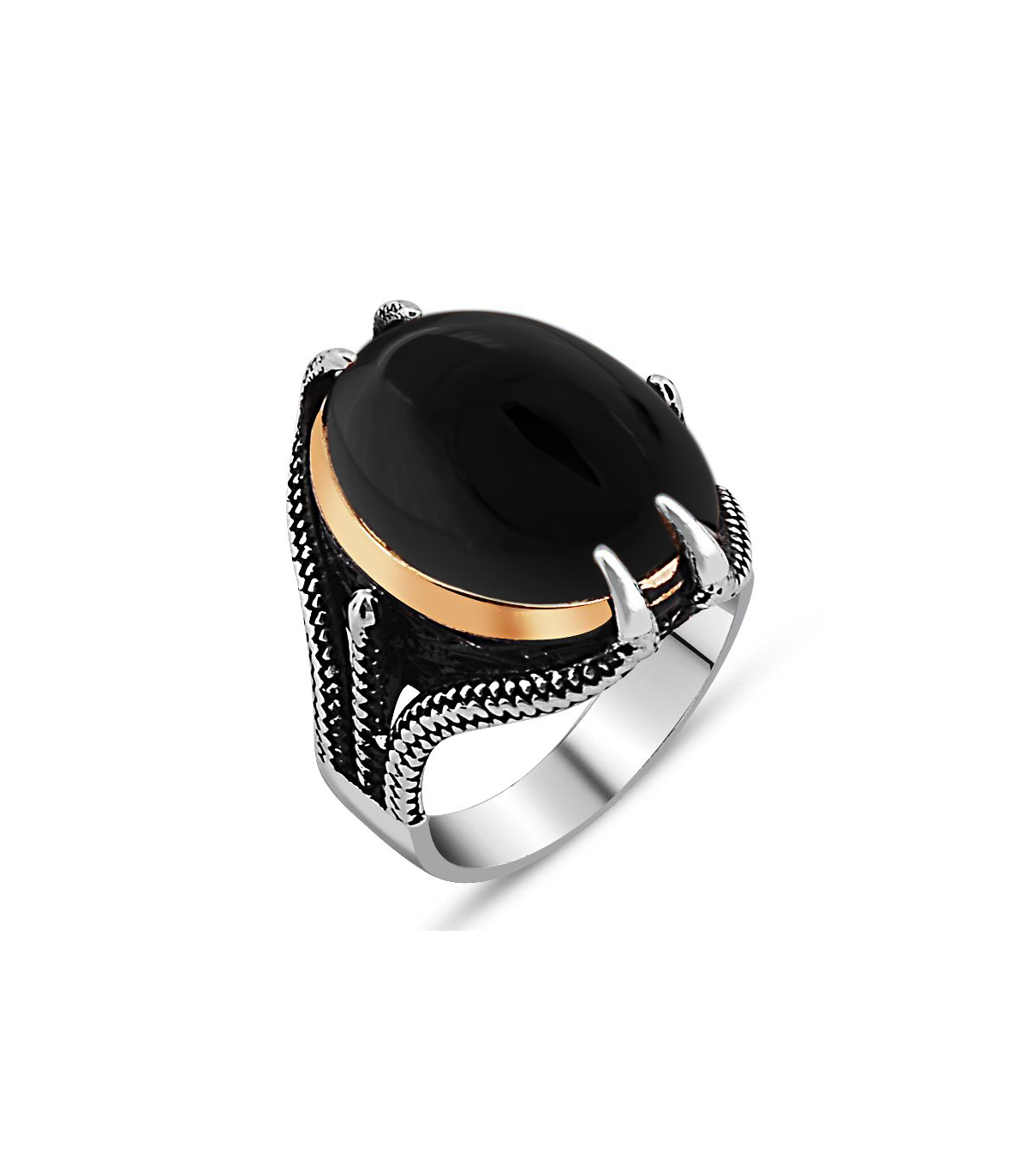 925 ayar gümüşten üretilmiş, siyah oniks taşlı, pençeli tasarımıyla şıklığı ve gücü simgeleyen erkek yüzük modeli.